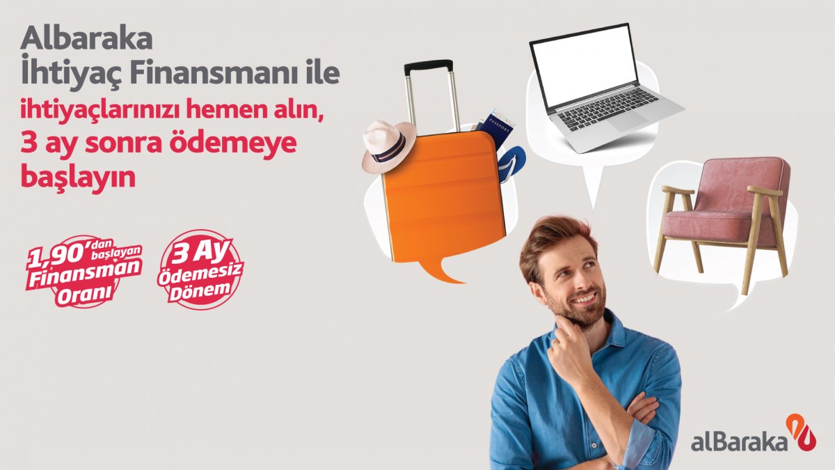 Araç ve konut finansmanı kampanyalarıyla birlikte muhtaçlık finansmanı kampanyasını da duyuran Albaraka Türk %1,90’dan başlayan kâr oranları ile ferdi müşterilere finansman sağlayacak. Bu kampanyada müşteriler, 3 ay ödemesiz periyot ve 36 aya varan vade imkânlarından yararlanabilecek.